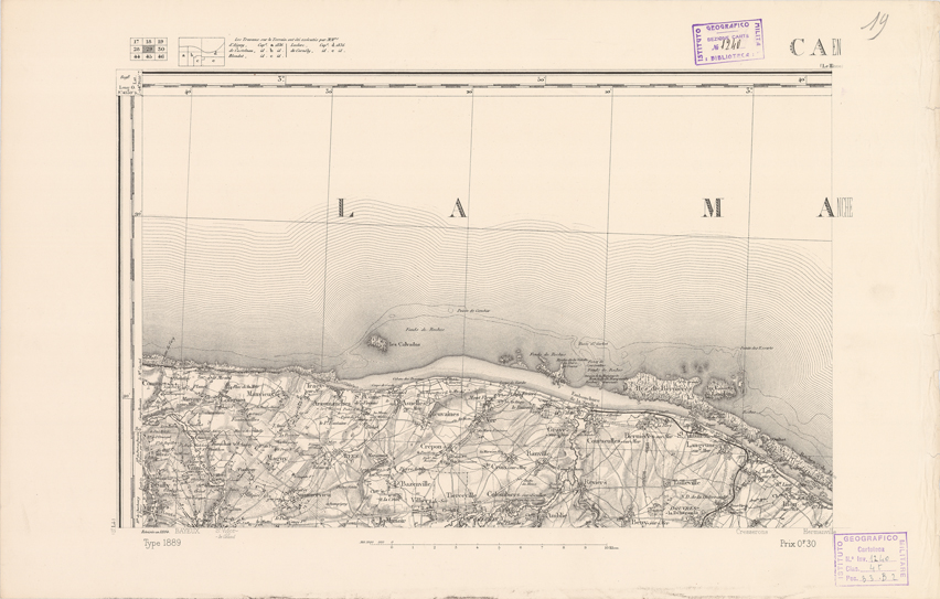 "Paris. Service Géographique de l'Armée, 1889. Ebbe origine dall'Edizione zincografica in quarti di foglio, stabilita dal 1879, per la carta detta de "L'Etat-Major". Infatti non rispondono più il sistema della riproduzione zincografica alle esigenze che la revisione dei fogli imponeva, per un inevitabile logoramento dei rami originali, fu proposta dapprima la correzione degli zinchi, ma questo, importando un lavoro lungo e gravoso, si adottò il procedimento galvanico. I rami galvanici ottenuti e corretti secondo questo sistema presero il nome di "édition type 1889". Allo scopo di facilitare l'incisione fu adoperata la suddivisione in quarti di foglio come per l'edizione zincografica. La revisione dei fogli di questo tipo non fu iniziata che nel 1893. Dal catalogo del S.G.A. risultano mancanti a questa edizione i dipartimenti della "Moselle", del "Bas-Rhin" e del "Haut-Rhin" per i quali non esiste che una edizione in fogli interi aggiornata nel 1901."