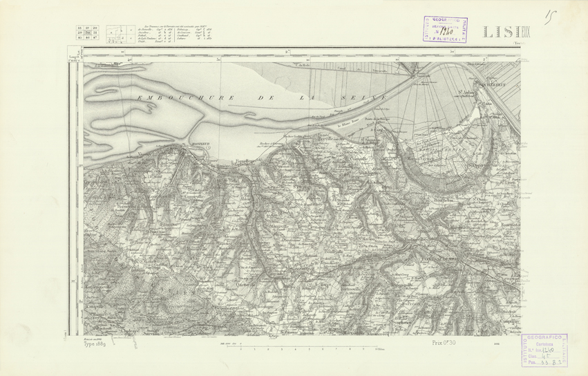 "Paris. Service Géographique de l'Armée, 1889. Ebbe origine dall'Edizione zincografica in quarti di foglio, stabilita dal 1879, per la carta detta de "L'Etat-Major". Infatti non rispondono più il sistema della riproduzione zincografica alle esigenze che la revisione dei fogli imponeva, per un inevitabile logoramento dei rami originali, fu proposta dapprima la correzione degli zinchi, ma questo, importando un lavoro lungo e gravoso, si adottò il procedimento galvanico. I rami galvanici ottenuti e corretti secondo questo sistema presero il nome di "édition type 1889". Allo scopo di facilitare l'incisione fu adoperata la suddivisione in quarti di foglio come per l'edizione zincografica. La revisione dei fogli di questo tipo non fu iniziata che nel 1893. Dal catalogo del S.G.A. risultano mancanti a questa edizione i dipartimenti della "Moselle", del "Bas-Rhin" e del "Haut-Rhin" per i quali non esiste che una edizione in fogli interi aggiornata nel 1901."