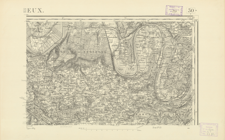 "Paris. Service Géographique de l'Armée, 1889. Ebbe origine dall'Edizione zincografica in quarti di foglio, stabilita dal 1879, per la carta detta de "L'Etat-Major". Infatti non rispondono più il sistema della riproduzione zincografica alle esigenze che la revisione dei fogli imponeva, per un inevitabile logoramento dei rami originali, fu proposta dapprima la correzione degli zinchi, ma questo, importando un lavoro lungo e gravoso, si adottò il procedimento galvanico. I rami galvanici ottenuti e corretti secondo questo sistema presero il nome di "édition type 1889". Allo scopo di facilitare l'incisione fu adoperata la suddivisione in quarti di foglio come per l'edizione zincografica. La revisione dei fogli di questo tipo non fu iniziata che nel 1893. Dal catalogo del S.G.A. risultano mancanti a questa edizione i dipartimenti della "Moselle", del "Bas-Rhin" e del "Haut-Rhin" per i quali non esiste che una edizione in fogli interi aggiornata nel 1901."