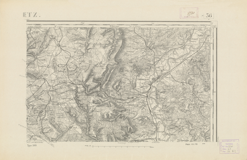 "Paris. Service Géographique de l'Armée, 1889. Ebbe origine dall'Edizione zincografica in quarti di foglio, stabilita dal 1879, per la carta detta de "L'Etat-Major". Infatti non rispondono più il sistema della riproduzione zincografica alle esigenze che la revisione dei fogli imponeva, per un inevitabile logoramento dei rami originali, fu proposta dapprima la correzione degli zinchi, ma questo, importando un lavoro lungo e gravoso, si adottò il procedimento galvanico. I rami galvanici ottenuti e corretti secondo questo sistema presero il nome di "édition type 1889". Allo scopo di facilitare l'incisione fu adoperata la suddivisione in quarti di foglio come per l'edizione zincografica. La revisione dei fogli di questo tipo non fu iniziata che nel 1893. Dal catalogo del S.G.A. risultano mancanti a questa edizione i dipartimenti della "Moselle", del "Bas-Rhin" e del "Haut-Rhin" per i quali non esiste che una edizione in fogli interi aggiornata nel 1901."
