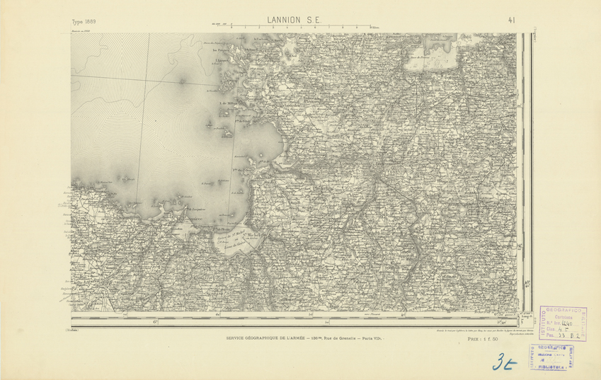 "Paris. Service Géographique de l'Armée, 1889. Ebbe origine dall'Edizione zincografica in quarti di foglio, stabilita dal 1879, per la carta detta de "L'Etat-Major". Infatti non rispondono più il sistema della riproduzione zincografica alle esigenze che la revisione dei fogli imponeva, per un inevitabile logoramento dei rami originali, fu proposta dapprima la correzione degli zinchi, ma questo, importando un lavoro lungo e gravoso, si adottò il procedimento galvanico. I rami galvanici ottenuti e corretti secondo questo sistema presero il nome di "édition type 1889". Allo scopo di facilitare l'incisione fu adoperata la suddivisione in quarti di foglio come per l'edizione zincografica. La revisione dei fogli di questo tipo non fu iniziata che nel 1893. Dal catalogo del S.G.A. risultano mancanti a questa edizione i dipartimenti della "Moselle", del "Bas-Rhin" e del "Haut-Rhin" per i quali non esiste che una edizione in fogli interi aggiornata nel 1901."