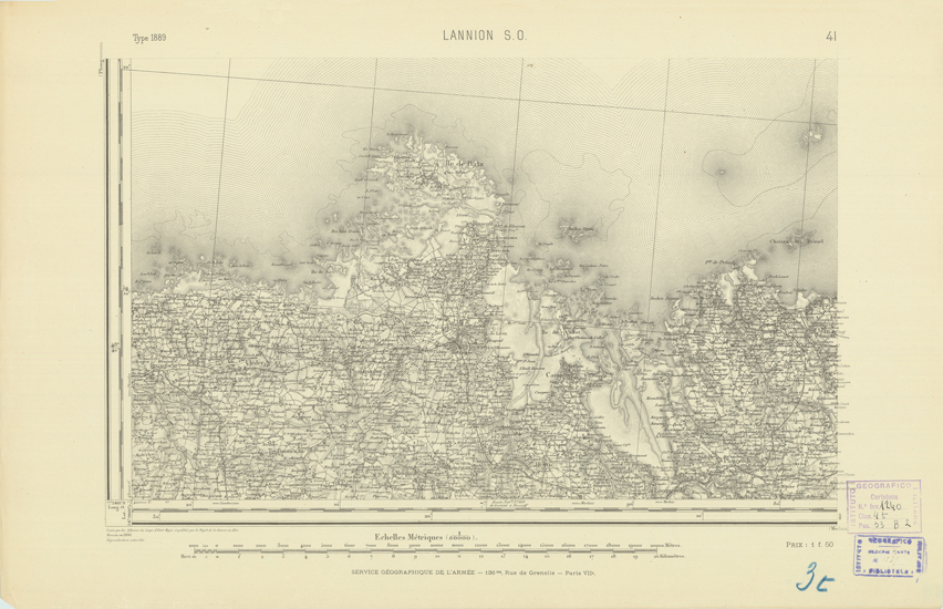 "Paris. Service Géographique de l'Armée, 1889. Ebbe origine dall'Edizione zincografica in quarti di foglio, stabilita dal 1879, per la carta detta de "L'Etat-Major". Infatti non rispondono più il sistema della riproduzione zincografica alle esigenze che la revisione dei fogli imponeva, per un inevitabile logoramento dei rami originali, fu proposta dapprima la correzione degli zinchi, ma questo, importando un lavoro lungo e gravoso, si adottò il procedimento galvanico. I rami galvanici ottenuti e corretti secondo questo sistema presero il nome di "édition type 1889". Allo scopo di facilitare l'incisione fu adoperata la suddivisione in quarti di foglio come per l'edizione zincografica. La revisione dei fogli di questo tipo non fu iniziata che nel 1893. Dal catalogo del S.G.A. risultano mancanti a questa edizione i dipartimenti della "Moselle", del "Bas-Rhin" e del "Haut-Rhin" per i quali non esiste che una edizione in fogli interi aggiornata nel 1901."