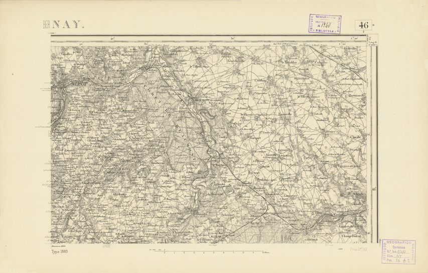 "Paris. Service Géographique de l'Armée, 1889. Ebbe origine dall'Edizione zincografica in quarti di foglio, stabilita dal 1879, per la carta detta de "L'Etat-Major". Infatti non rispondono più il sistema della riproduzione zincografica alle esigenze che la revisione dei fogli imponeva, per un inevitabile logoramento dei rami originali, fu proposta dapprima la correzione degli zinchi, ma questo, importando un lavoro lungo e gravoso, si adottò il procedimento galvanico. I rami galvanici ottenuti e corretti secondo questo sistema presero il nome di "édition type 1889". Allo scopo di facilitare l'incisione fu adoperata la suddivisione in quarti di foglio come per l'edizione zincografica. La revisione dei fogli di questo tipo non fu iniziata che nel 1893. Dal catalogo del S.G.A. risultano mancanti a questa edizione i dipartimenti della "Moselle", del "Bas-Rhin" e del "Haut-Rhin" per i quali non esiste che una edizione in fogli interi aggiornata nel 1901."