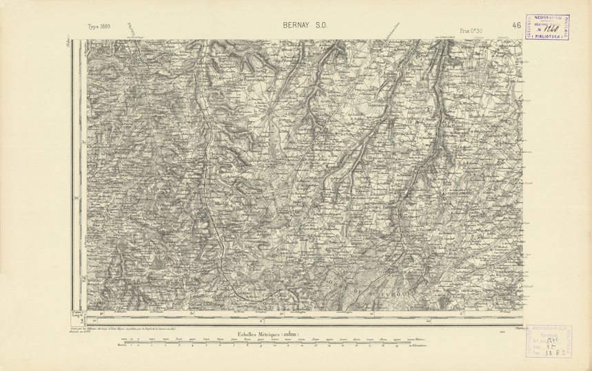 "Paris. Service Géographique de l'Armée, 1889. Ebbe origine dall'Edizione zincografica in quarti di foglio, stabilita dal 1879, per la carta detta de "L'Etat-Major". Infatti non rispondono più il sistema della riproduzione zincografica alle esigenze che la revisione dei fogli imponeva, per un inevitabile logoramento dei rami originali, fu proposta dapprima la correzione degli zinchi, ma questo, importando un lavoro lungo e gravoso, si adottò il procedimento galvanico. I rami galvanici ottenuti e corretti secondo questo sistema presero il nome di "édition type 1889". Allo scopo di facilitare l'incisione fu adoperata la suddivisione in quarti di foglio come per l'edizione zincografica. La revisione dei fogli di questo tipo non fu iniziata che nel 1893. Dal catalogo del S.G.A. risultano mancanti a questa edizione i dipartimenti della "Moselle", del "Bas-Rhin" e del "Haut-Rhin" per i quali non esiste che una edizione in fogli interi aggiornata nel 1901."