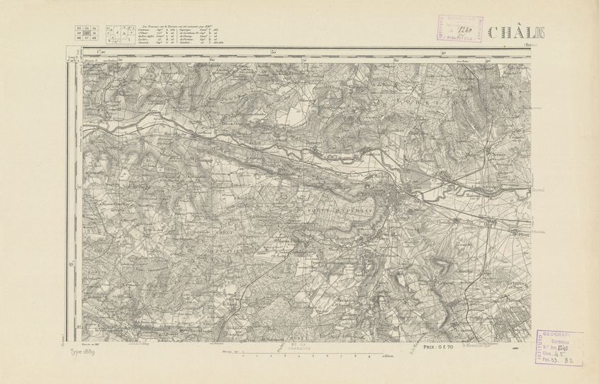 "Paris. Service Géographique de l'Armée, 1889. Ebbe origine dall'Edizione zincografica in quarti di foglio, stabilita dal 1879, per la carta detta de "L'Etat-Major". Infatti non rispondono più il sistema della riproduzione zincografica alle esigenze che la revisione dei fogli imponeva, per un inevitabile logoramento dei rami originali, fu proposta dapprima la correzione degli zinchi, ma questo, importando un lavoro lungo e gravoso, si adottò il procedimento galvanico. I rami galvanici ottenuti e corretti secondo questo sistema presero il nome di "édition type 1889". Allo scopo di facilitare l'incisione fu adoperata la suddivisione in quarti di foglio come per l'edizione zincografica. La revisione dei fogli di questo tipo non fu iniziata che nel 1893. Dal catalogo del S.G.A. risultano mancanti a questa edizione i dipartimenti della "Moselle", del "Bas-Rhin" e del "Haut-Rhin" per i quali non esiste che una edizione in fogli interi aggiornata nel 1901."