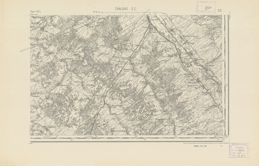 "Paris. Service Géographique de l'Armée, 1889. Ebbe origine dall'Edizione zincografica in quarti di foglio, stabilita dal 1879, per la carta detta de "L'Etat-Major". Infatti non rispondono più il sistema della riproduzione zincografica alle esigenze che la revisione dei fogli imponeva, per un inevitabile logoramento dei rami originali, fu proposta dapprima la correzione degli zinchi, ma questo, importando un lavoro lungo e gravoso, si adottò il procedimento galvanico. I rami galvanici ottenuti e corretti secondo questo sistema presero il nome di "édition type 1889". Allo scopo di facilitare l'incisione fu adoperata la suddivisione in quarti di foglio come per l'edizione zincografica. La revisione dei fogli di questo tipo non fu iniziata che nel 1893. Dal catalogo del S.G.A. risultano mancanti a questa edizione i dipartimenti della "Moselle", del "Bas-Rhin" e del "Haut-Rhin" per i quali non esiste che una edizione in fogli interi aggiornata nel 1901."