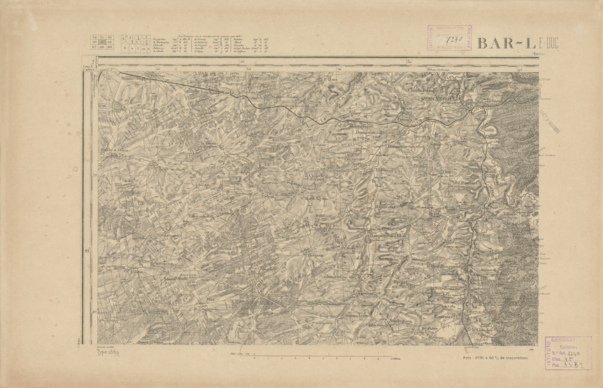 "Paris. Service Géographique de l'Armée, 1889. Ebbe origine dall'Edizione zincografica in quarti di foglio, stabilita dal 1879, per la carta detta de "L'Etat-Major". Infatti non rispondono più il sistema della riproduzione zincografica alle esigenze che la revisione dei fogli imponeva, per un inevitabile logoramento dei rami originali, fu proposta dapprima la correzione degli zinchi, ma questo, importando un lavoro lungo e gravoso, si adottò il procedimento galvanico. I rami galvanici ottenuti e corretti secondo questo sistema presero il nome di "édition type 1889". Allo scopo di facilitare l'incisione fu adoperata la suddivisione in quarti di foglio come per l'edizione zincografica. La revisione dei fogli di questo tipo non fu iniziata che nel 1893. Dal catalogo del S.G.A. risultano mancanti a questa edizione i dipartimenti della "Moselle", del "Bas-Rhin" e del "Haut-Rhin" per i quali non esiste che una edizione in fogli interi aggiornata nel 1901."