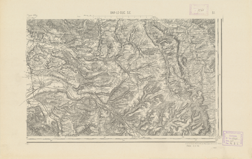 "Paris. Service Géographique de l'Armée, 1889. Ebbe origine dall'Edizione zincografica in quarti di foglio, stabilita dal 1879, per la carta detta de "L'Etat-Major". Infatti non rispondono più il sistema della riproduzione zincografica alle esigenze che la revisione dei fogli imponeva, per un inevitabile logoramento dei rami originali, fu proposta dapprima la correzione degli zinchi, ma questo, importando un lavoro lungo e gravoso, si adottò il procedimento galvanico. I rami galvanici ottenuti e corretti secondo questo sistema presero il nome di "édition type 1889". Allo scopo di facilitare l'incisione fu adoperata la suddivisione in quarti di foglio come per l'edizione zincografica. La revisione dei fogli di questo tipo non fu iniziata che nel 1893. Dal catalogo del S.G.A. risultano mancanti a questa edizione i dipartimenti della "Moselle", del "Bas-Rhin" e del "Haut-Rhin" per i quali non esiste che una edizione in fogli interi aggiornata nel 1901."