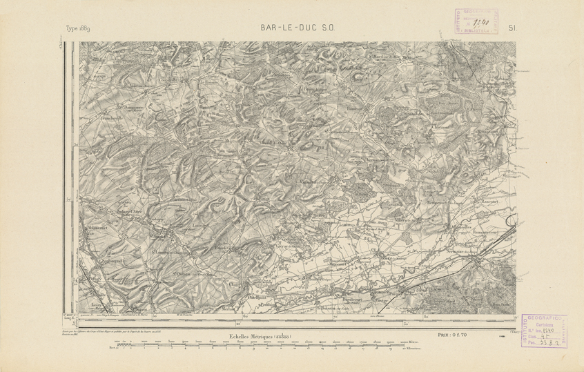 "Paris. Service Géographique de l'Armée, 1889. Ebbe origine dall'Edizione zincografica in quarti di foglio, stabilita dal 1879, per la carta detta de "L'Etat-Major". Infatti non rispondono più il sistema della riproduzione zincografica alle esigenze che la revisione dei fogli imponeva, per un inevitabile logoramento dei rami originali, fu proposta dapprima la correzione degli zinchi, ma questo, importando un lavoro lungo e gravoso, si adottò il procedimento galvanico. I rami galvanici ottenuti e corretti secondo questo sistema presero il nome di "édition type 1889". Allo scopo di facilitare l'incisione fu adoperata la suddivisione in quarti di foglio come per l'edizione zincografica. La revisione dei fogli di questo tipo non fu iniziata che nel 1893. Dal catalogo del S.G.A. risultano mancanti a questa edizione i dipartimenti della "Moselle", del "Bas-Rhin" e del "Haut-Rhin" per i quali non esiste che una edizione in fogli interi aggiornata nel 1901."