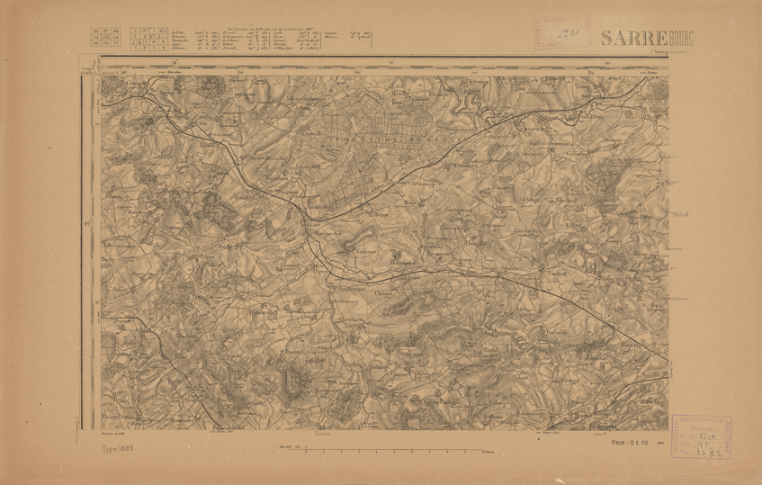 "Paris. Service Géographique de l'Armée, 1889. Ebbe origine dall'Edizione zincografica in quarti di foglio, stabilita dal 1879, per la carta detta de "L'Etat-Major". Infatti non rispondono più il sistema della riproduzione zincografica alle esigenze che la revisione dei fogli imponeva, per un inevitabile logoramento dei rami originali, fu proposta dapprima la correzione degli zinchi, ma questo, importando un lavoro lungo e gravoso, si adottò il procedimento galvanico. I rami galvanici ottenuti e corretti secondo questo sistema presero il nome di "édition type 1889". Allo scopo di facilitare l'incisione fu adoperata la suddivisione in quarti di foglio come per l'edizione zincografica. La revisione dei fogli di questo tipo non fu iniziata che nel 1893. Dal catalogo del S.G.A. risultano mancanti a questa edizione i dipartimenti della "Moselle", del "Bas-Rhin" e del "Haut-Rhin" per i quali non esiste che una edizione in fogli interi aggiornata nel 1901."