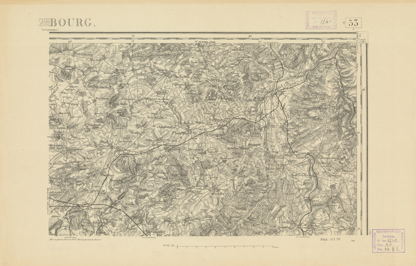 "Paris. Service Géographique de l'Armée, 1889. Ebbe origine dall'Edizione zincografica in quarti di foglio, stabilita dal 1879, per la carta detta de "L'Etat-Major". Infatti non rispondono più il sistema della riproduzione zincografica alle esigenze che la revisione dei fogli imponeva, per un inevitabile logoramento dei rami originali, fu proposta dapprima la correzione degli zinchi, ma questo, importando un lavoro lungo e gravoso, si adottò il procedimento galvanico. I rami galvanici ottenuti e corretti secondo questo sistema presero il nome di "édition type 1889". Allo scopo di facilitare l'incisione fu adoperata la suddivisione in quarti di foglio come per l'edizione zincografica. La revisione dei fogli di questo tipo non fu iniziata che nel 1893. Dal catalogo del S.G.A. risultano mancanti a questa edizione i dipartimenti della "Moselle", del "Bas-Rhin" e del "Haut-Rhin" per i quali non esiste che una edizione in fogli interi aggiornata nel 1901."