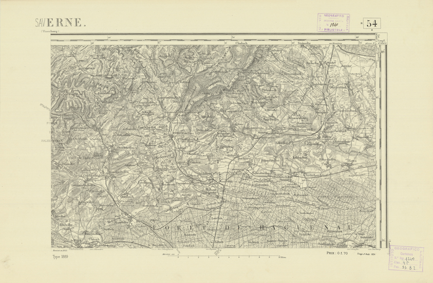 "Paris. Service Géographique de l'Armée, 1889. Ebbe origine dall'Edizione zincografica in quarti di foglio, stabilita dal 1879, per la carta detta de "L'Etat-Major". Infatti non rispondono più il sistema della riproduzione zincografica alle esigenze che la revisione dei fogli imponeva, per un inevitabile logoramento dei rami originali, fu proposta dapprima la correzione degli zinchi, ma questo, importando un lavoro lungo e gravoso, si adottò il procedimento galvanico. I rami galvanici ottenuti e corretti secondo questo sistema presero il nome di "édition type 1889". Allo scopo di facilitare l'incisione fu adoperata la suddivisione in quarti di foglio come per l'edizione zincografica. La revisione dei fogli di questo tipo non fu iniziata che nel 1893. Dal catalogo del S.G.A. risultano mancanti a questa edizione i dipartimenti della "Moselle", del "Bas-Rhin" e del "Haut-Rhin" per i quali non esiste che una edizione in fogli interi aggiornata nel 1901."
