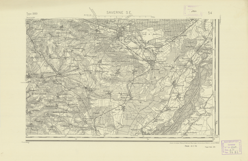 "Paris. Service Géographique de l'Armée, 1889. Ebbe origine dall'Edizione zincografica in quarti di foglio, stabilita dal 1879, per la carta detta de "L'Etat-Major". Infatti non rispondono più il sistema della riproduzione zincografica alle esigenze che la revisione dei fogli imponeva, per un inevitabile logoramento dei rami originali, fu proposta dapprima la correzione degli zinchi, ma questo, importando un lavoro lungo e gravoso, si adottò il procedimento galvanico. I rami galvanici ottenuti e corretti secondo questo sistema presero il nome di "édition type 1889". Allo scopo di facilitare l'incisione fu adoperata la suddivisione in quarti di foglio come per l'edizione zincografica. La revisione dei fogli di questo tipo non fu iniziata che nel 1893. Dal catalogo del S.G.A. risultano mancanti a questa edizione i dipartimenti della "Moselle", del "Bas-Rhin" e del "Haut-Rhin" per i quali non esiste che una edizione in fogli interi aggiornata nel 1901."