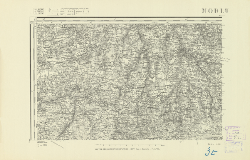 "Paris. Service Géographique de l'Armée, 1889. Ebbe origine dall'Edizione zincografica in quarti di foglio, stabilita dal 1879, per la carta detta de "L'Etat-Major". Infatti non rispondono più il sistema della riproduzione zincografica alle esigenze che la revisione dei fogli imponeva, per un inevitabile logoramento dei rami originali, fu proposta dapprima la correzione degli zinchi, ma questo, importando un lavoro lungo e gravoso, si adottò il procedimento galvanico. I rami galvanici ottenuti e corretti secondo questo sistema presero il nome di "édition type 1889". Allo scopo di facilitare l'incisione fu adoperata la suddivisione in quarti di foglio come per l'edizione zincografica. La revisione dei fogli di questo tipo non fu iniziata che nel 1893. Dal catalogo del S.G.A. risultano mancanti a questa edizione i dipartimenti della "Moselle", del "Bas-Rhin" e del "Haut-Rhin" per i quali non esiste che una edizione in fogli interi aggiornata nel 1901."