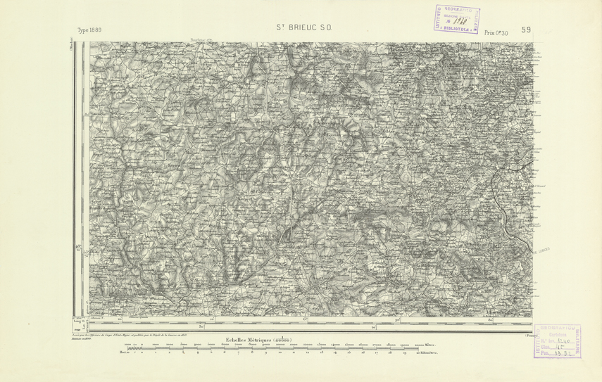 "Paris. Service Géographique de l'Armée, 1889. Ebbe origine dall'Edizione zincografica in quarti di foglio, stabilita dal 1879, per la carta detta de "L'Etat-Major". Infatti non rispondono più il sistema della riproduzione zincografica alle esigenze che la revisione dei fogli imponeva, per un inevitabile logoramento dei rami originali, fu proposta dapprima la correzione degli zinchi, ma questo, importando un lavoro lungo e gravoso, si adottò il procedimento galvanico. I rami galvanici ottenuti e corretti secondo questo sistema presero il nome di "édition type 1889". Allo scopo di facilitare l'incisione fu adoperata la suddivisione in quarti di foglio come per l'edizione zincografica. La revisione dei fogli di questo tipo non fu iniziata che nel 1893. Dal catalogo del S.G.A. risultano mancanti a questa edizione i dipartimenti della "Moselle", del "Bas-Rhin" e del "Haut-Rhin" per i quali non esiste che una edizione in fogli interi aggiornata nel 1901."