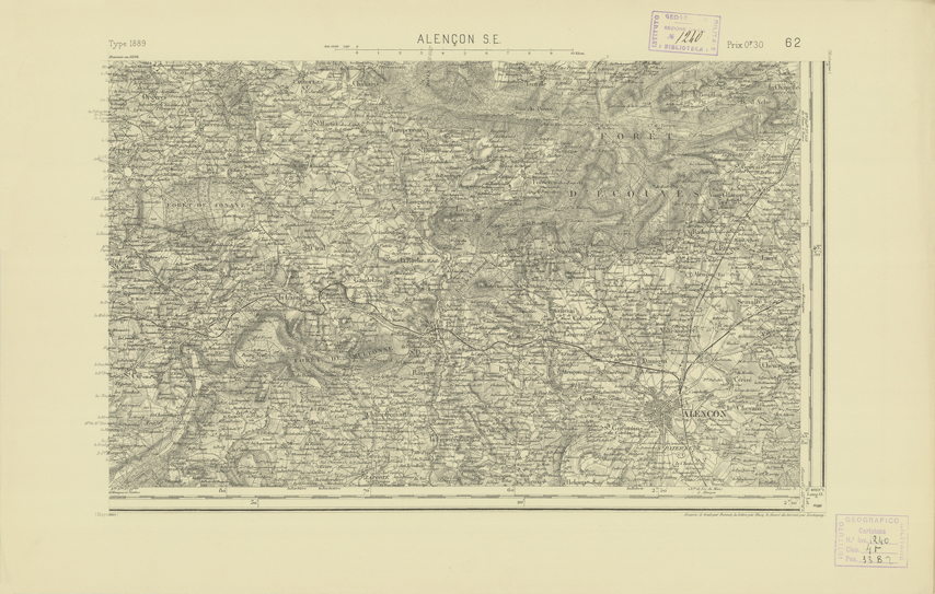 "Paris. Service Géographique de l'Armée, 1889. Ebbe origine dall'Edizione zincografica in quarti di foglio, stabilita dal 1879, per la carta detta de "L'Etat-Major". Infatti non rispondono più il sistema della riproduzione zincografica alle esigenze che la revisione dei fogli imponeva, per un inevitabile logoramento dei rami originali, fu proposta dapprima la correzione degli zinchi, ma questo, importando un lavoro lungo e gravoso, si adottò il procedimento galvanico. I rami galvanici ottenuti e corretti secondo questo sistema presero il nome di "édition type 1889". Allo scopo di facilitare l'incisione fu adoperata la suddivisione in quarti di foglio come per l'edizione zincografica. La revisione dei fogli di questo tipo non fu iniziata che nel 1893. Dal catalogo del S.G.A. risultano mancanti a questa edizione i dipartimenti della "Moselle", del "Bas-Rhin" e del "Haut-Rhin" per i quali non esiste che una edizione in fogli interi aggiornata nel 1901."