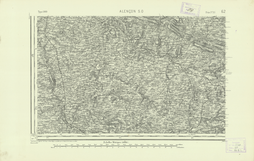 "Paris. Service Géographique de l'Armée, 1889. Ebbe origine dall'Edizione zincografica in quarti di foglio, stabilita dal 1879, per la carta detta de "L'Etat-Major". Infatti non rispondono più il sistema della riproduzione zincografica alle esigenze che la revisione dei fogli imponeva, per un inevitabile logoramento dei rami originali, fu proposta dapprima la correzione degli zinchi, ma questo, importando un lavoro lungo e gravoso, si adottò il procedimento galvanico. I rami galvanici ottenuti e corretti secondo questo sistema presero il nome di "édition type 1889". Allo scopo di facilitare l'incisione fu adoperata la suddivisione in quarti di foglio come per l'edizione zincografica. La revisione dei fogli di questo tipo non fu iniziata che nel 1893. Dal catalogo del S.G.A. risultano mancanti a questa edizione i dipartimenti della "Moselle", del "Bas-Rhin" e del "Haut-Rhin" per i quali non esiste che una edizione in fogli interi aggiornata nel 1901."
