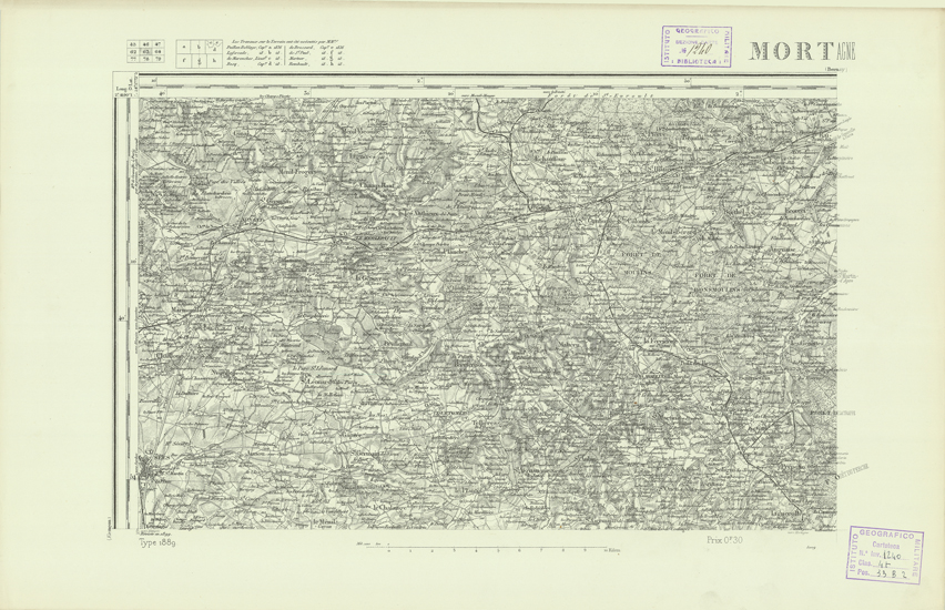 "Paris. Service Géographique de l'Armée, 1889. Ebbe origine dall'Edizione zincografica in quarti di foglio, stabilita dal 1879, per la carta detta de "L'Etat-Major". Infatti non rispondono più il sistema della riproduzione zincografica alle esigenze che la revisione dei fogli imponeva, per un inevitabile logoramento dei rami originali, fu proposta dapprima la correzione degli zinchi, ma questo, importando un lavoro lungo e gravoso, si adottò il procedimento galvanico. I rami galvanici ottenuti e corretti secondo questo sistema presero il nome di "édition type 1889". Allo scopo di facilitare l'incisione fu adoperata la suddivisione in quarti di foglio come per l'edizione zincografica. La revisione dei fogli di questo tipo non fu iniziata che nel 1893. Dal catalogo del S.G.A. risultano mancanti a questa edizione i dipartimenti della "Moselle", del "Bas-Rhin" e del "Haut-Rhin" per i quali non esiste che una edizione in fogli interi aggiornata nel 1901."
