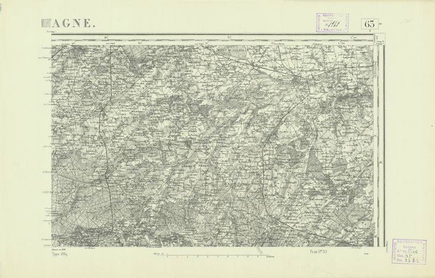 "Paris. Service Géographique de l'Armée, 1889. Ebbe origine dall'Edizione zincografica in quarti di foglio, stabilita dal 1879, per la carta detta de "L'Etat-Major". Infatti non rispondono più il sistema della riproduzione zincografica alle esigenze che la revisione dei fogli imponeva, per un inevitabile logoramento dei rami originali, fu proposta dapprima la correzione degli zinchi, ma questo, importando un lavoro lungo e gravoso, si adottò il procedimento galvanico. I rami galvanici ottenuti e corretti secondo questo sistema presero il nome di "édition type 1889". Allo scopo di facilitare l'incisione fu adoperata la suddivisione in quarti di foglio come per l'edizione zincografica. La revisione dei fogli di questo tipo non fu iniziata che nel 1893. Dal catalogo del S.G.A. risultano mancanti a questa edizione i dipartimenti della "Moselle", del "Bas-Rhin" e del "Haut-Rhin" per i quali non esiste che una edizione in fogli interi aggiornata nel 1901."