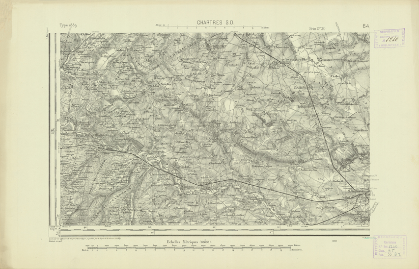 "Paris. Service Géographique de l'Armée, 1889. Ebbe origine dall'Edizione zincografica in quarti di foglio, stabilita dal 1879, per la carta detta de "L'Etat-Major". Infatti non rispondono più il sistema della riproduzione zincografica alle esigenze che la revisione dei fogli imponeva, per un inevitabile logoramento dei rami originali, fu proposta dapprima la correzione degli zinchi, ma questo, importando un lavoro lungo e gravoso, si adottò il procedimento galvanico. I rami galvanici ottenuti e corretti secondo questo sistema presero il nome di "édition type 1889". Allo scopo di facilitare l'incisione fu adoperata la suddivisione in quarti di foglio come per l'edizione zincografica. La revisione dei fogli di questo tipo non fu iniziata che nel 1893. Dal catalogo del S.G.A. risultano mancanti a questa edizione i dipartimenti della "Moselle", del "Bas-Rhin" e del "Haut-Rhin" per i quali non esiste che una edizione in fogli interi aggiornata nel 1901."