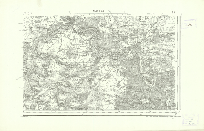 "Paris. Service Géographique de l'Armée, 1889. Ebbe origine dall'Edizione zincografica in quarti di foglio, stabilita dal 1879, per la carta detta de "L'Etat-Major". Infatti non rispondono più il sistema della riproduzione zincografica alle esigenze che la revisione dei fogli imponeva, per un inevitabile logoramento dei rami originali, fu proposta dapprima la correzione degli zinchi, ma questo, importando un lavoro lungo e gravoso, si adottò il procedimento galvanico. I rami galvanici ottenuti e corretti secondo questo sistema presero il nome di "édition type 1889". Allo scopo di facilitare l'incisione fu adoperata la suddivisione in quarti di foglio come per l'edizione zincografica. La revisione dei fogli di questo tipo non fu iniziata che nel 1893. Dal catalogo del S.G.A. risultano mancanti a questa edizione i dipartimenti della "Moselle", del "Bas-Rhin" e del "Haut-Rhin" per i quali non esiste che una edizione in fogli interi aggiornata nel 1901."