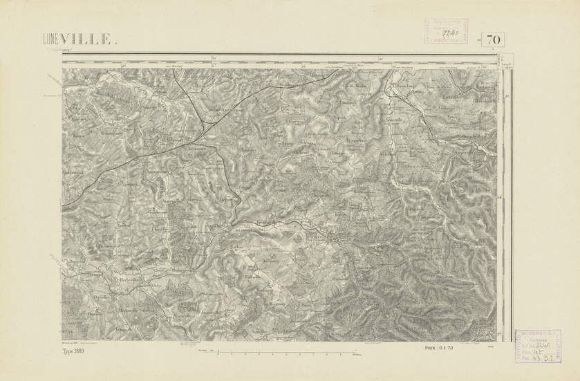"Paris. Service Géographique de l'Armée, 1889. Ebbe origine dall'Edizione zincografica in quarti di foglio, stabilita dal 1879, per la carta detta de "L'Etat-Major". Infatti non rispondono più il sistema della riproduzione zincografica alle esigenze che la revisione dei fogli imponeva, per un inevitabile logoramento dei rami originali, fu proposta dapprima la correzione degli zinchi, ma questo, importando un lavoro lungo e gravoso, si adottò il procedimento galvanico. I rami galvanici ottenuti e corretti secondo questo sistema presero il nome di "édition type 1889". Allo scopo di facilitare l'incisione fu adoperata la suddivisione in quarti di foglio come per l'edizione zincografica. La revisione dei fogli di questo tipo non fu iniziata che nel 1893. Dal catalogo del S.G.A. risultano mancanti a questa edizione i dipartimenti della "Moselle", del "Bas-Rhin" e del "Haut-Rhin" per i quali non esiste che una edizione in fogli interi aggiornata nel 1901."