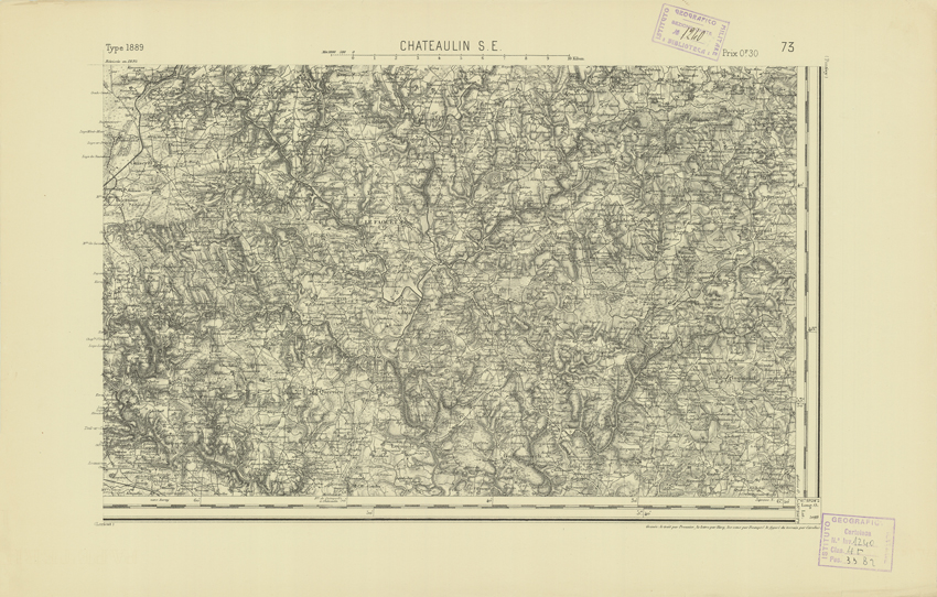 "Paris. Service Géographique de l'Armée, 1889. Ebbe origine dall'Edizione zincografica in quarti di foglio, stabilita dal 1879, per la carta detta de "L'Etat-Major". Infatti non rispondono più il sistema della riproduzione zincografica alle esigenze che la revisione dei fogli imponeva, per un inevitabile logoramento dei rami originali, fu proposta dapprima la correzione degli zinchi, ma questo, importando un lavoro lungo e gravoso, si adottò il procedimento galvanico. I rami galvanici ottenuti e corretti secondo questo sistema presero il nome di "édition type 1889". Allo scopo di facilitare l'incisione fu adoperata la suddivisione in quarti di foglio come per l'edizione zincografica. La revisione dei fogli di questo tipo non fu iniziata che nel 1893. Dal catalogo del S.G.A. risultano mancanti a questa edizione i dipartimenti della "Moselle", del "Bas-Rhin" e del "Haut-Rhin" per i quali non esiste che una edizione in fogli interi aggiornata nel 1901."