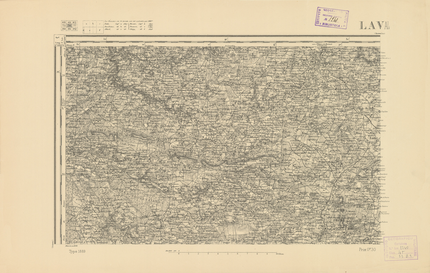 "Paris. Service Géographique de l'Armée, 1889. Ebbe origine dall'Edizione zincografica in quarti di foglio, stabilita dal 1879, per la carta detta de "L'Etat-Major". Infatti non rispondono più il sistema della riproduzione zincografica alle esigenze che la revisione dei fogli imponeva, per un inevitabile logoramento dei rami originali, fu proposta dapprima la correzione degli zinchi, ma questo, importando un lavoro lungo e gravoso, si adottò il procedimento galvanico. I rami galvanici ottenuti e corretti secondo questo sistema presero il nome di "édition type 1889". Allo scopo di facilitare l'incisione fu adoperata la suddivisione in quarti di foglio come per l'edizione zincografica. La revisione dei fogli di questo tipo non fu iniziata che nel 1893. Dal catalogo del S.G.A. risultano mancanti a questa edizione i dipartimenti della "Moselle", del "Bas-Rhin" e del "Haut-Rhin" per i quali non esiste che una edizione in fogli interi aggiornata nel 1901."