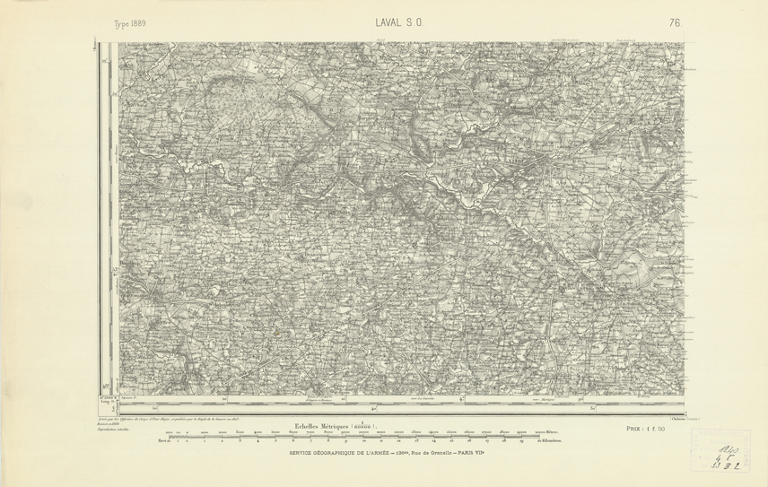 "Paris. Service Géographique de l'Armée, 1889. Ebbe origine dall'Edizione zincografica in quarti di foglio, stabilita dal 1879, per la carta detta de "L'Etat-Major". Infatti non rispondono più il sistema della riproduzione zincografica alle esigenze che la revisione dei fogli imponeva, per un inevitabile logoramento dei rami originali, fu proposta dapprima la correzione degli zinchi, ma questo, importando un lavoro lungo e gravoso, si adottò il procedimento galvanico. I rami galvanici ottenuti e corretti secondo questo sistema presero il nome di "édition type 1889". Allo scopo di facilitare l'incisione fu adoperata la suddivisione in quarti di foglio come per l'edizione zincografica. La revisione dei fogli di questo tipo non fu iniziata che nel 1893. Dal catalogo del S.G.A. risultano mancanti a questa edizione i dipartimenti della "Moselle", del "Bas-Rhin" e del "Haut-Rhin" per i quali non esiste che una edizione in fogli interi aggiornata nel 1901."