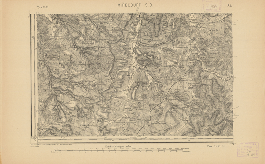 "Paris. Service Géographique de l'Armée, 1889. Ebbe origine dall'Edizione zincografica in quarti di foglio, stabilita dal 1879, per la carta detta de "L'Etat-Major". Infatti non rispondono più il sistema della riproduzione zincografica alle esigenze che la revisione dei fogli imponeva, per un inevitabile logoramento dei rami originali, fu proposta dapprima la correzione degli zinchi, ma questo, importando un lavoro lungo e gravoso, si adottò il procedimento galvanico. I rami galvanici ottenuti e corretti secondo questo sistema presero il nome di "édition type 1889". Allo scopo di facilitare l'incisione fu adoperata la suddivisione in quarti di foglio come per l'edizione zincografica. La revisione dei fogli di questo tipo non fu iniziata che nel 1893. Dal catalogo del S.G.A. risultano mancanti a questa edizione i dipartimenti della "Moselle", del "Bas-Rhin" e del "Haut-Rhin" per i quali non esiste che una edizione in fogli interi aggiornata nel 1901."