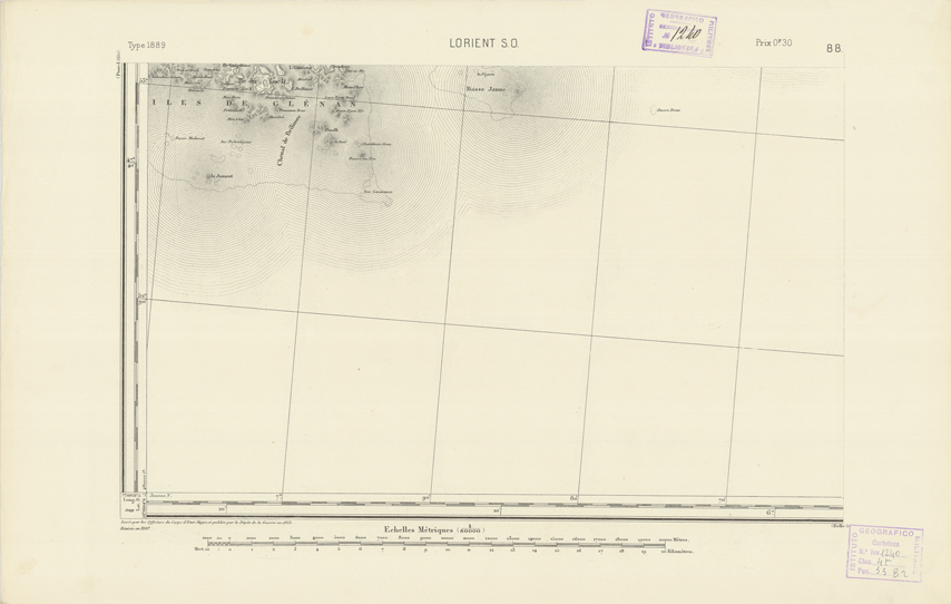 "Paris. Service Géographique de l'Armée, 1889. Ebbe origine dall'Edizione zincografica in quarti di foglio, stabilita dal 1879, per la carta detta de "L'Etat-Major". Infatti non rispondono più il sistema della riproduzione zincografica alle esigenze che la revisione dei fogli imponeva, per un inevitabile logoramento dei rami originali, fu proposta dapprima la correzione degli zinchi, ma questo, importando un lavoro lungo e gravoso, si adottò il procedimento galvanico. I rami galvanici ottenuti e corretti secondo questo sistema presero il nome di "édition type 1889". Allo scopo di facilitare l'incisione fu adoperata la suddivisione in quarti di foglio come per l'edizione zincografica. La revisione dei fogli di questo tipo non fu iniziata che nel 1893. Dal catalogo del S.G.A. risultano mancanti a questa edizione i dipartimenti della "Moselle", del "Bas-Rhin" e del "Haut-Rhin" per i quali non esiste che una edizione in fogli interi aggiornata nel 1901."