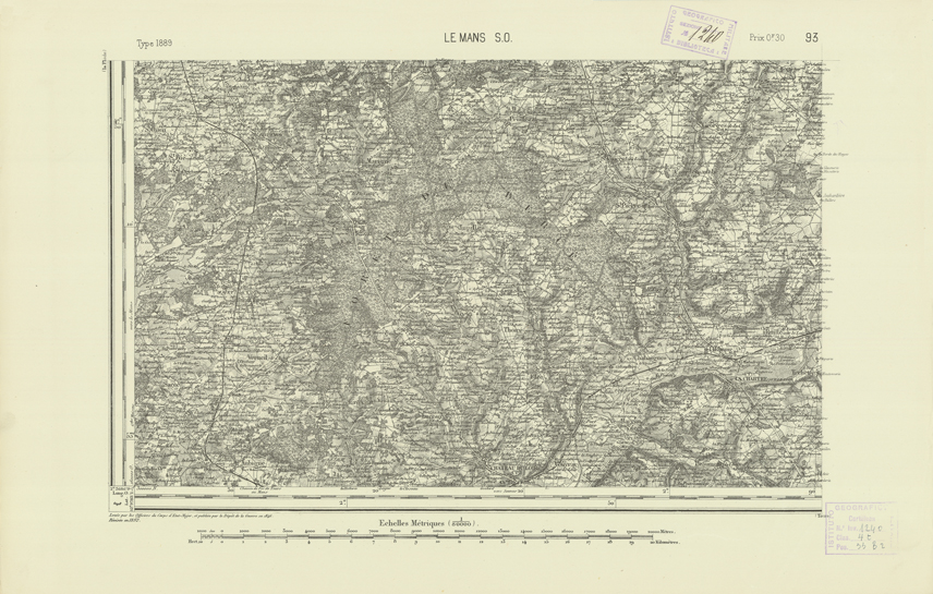 "Paris. Service Géographique de l'Armée, 1889. Ebbe origine dall'Edizione zincografica in quarti di foglio, stabilita dal 1879, per la carta detta de "L'Etat-Major". Infatti non rispondono più il sistema della riproduzione zincografica alle esigenze che la revisione dei fogli imponeva, per un inevitabile logoramento dei rami originali, fu proposta dapprima la correzione degli zinchi, ma questo, importando un lavoro lungo e gravoso, si adottò il procedimento galvanico. I rami galvanici ottenuti e corretti secondo questo sistema presero il nome di "édition type 1889". Allo scopo di facilitare l'incisione fu adoperata la suddivisione in quarti di foglio come per l'edizione zincografica. La revisione dei fogli di questo tipo non fu iniziata che nel 1893. Dal catalogo del S.G.A. risultano mancanti a questa edizione i dipartimenti della "Moselle", del "Bas-Rhin" e del "Haut-Rhin" per i quali non esiste che una edizione in fogli interi aggiornata nel 1901."