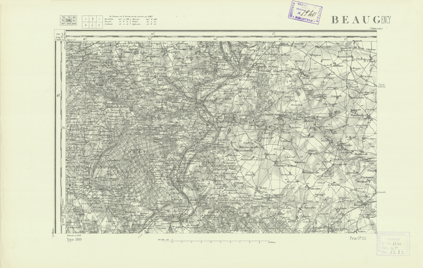 "Paris. Service Géographique de l'Armée, 1889. Ebbe origine dall'Edizione zincografica in quarti di foglio, stabilita dal 1879, per la carta detta de "L'Etat-Major". Infatti non rispondono più il sistema della riproduzione zincografica alle esigenze che la revisione dei fogli imponeva, per un inevitabile logoramento dei rami originali, fu proposta dapprima la correzione degli zinchi, ma questo, importando un lavoro lungo e gravoso, si adottò il procedimento galvanico. I rami galvanici ottenuti e corretti secondo questo sistema presero il nome di "édition type 1889". Allo scopo di facilitare l'incisione fu adoperata la suddivisione in quarti di foglio come per l'edizione zincografica. La revisione dei fogli di questo tipo non fu iniziata che nel 1893. Dal catalogo del S.G.A. risultano mancanti a questa edizione i dipartimenti della "Moselle", del "Bas-Rhin" e del "Haut-Rhin" per i quali non esiste che una edizione in fogli interi aggiornata nel 1901."