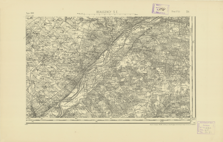 "Paris. Service Géographique de l'Armée, 1889. Ebbe origine dall'Edizione zincografica in quarti di foglio, stabilita dal 1879, per la carta detta de "L'Etat-Major". Infatti non rispondono più il sistema della riproduzione zincografica alle esigenze che la revisione dei fogli imponeva, per un inevitabile logoramento dei rami originali, fu proposta dapprima la correzione degli zinchi, ma questo, importando un lavoro lungo e gravoso, si adottò il procedimento galvanico. I rami galvanici ottenuti e corretti secondo questo sistema presero il nome di "édition type 1889". Allo scopo di facilitare l'incisione fu adoperata la suddivisione in quarti di foglio come per l'edizione zincografica. La revisione dei fogli di questo tipo non fu iniziata che nel 1893. Dal catalogo del S.G.A. risultano mancanti a questa edizione i dipartimenti della "Moselle", del "Bas-Rhin" e del "Haut-Rhin" per i quali non esiste che una edizione in fogli interi aggiornata nel 1901."