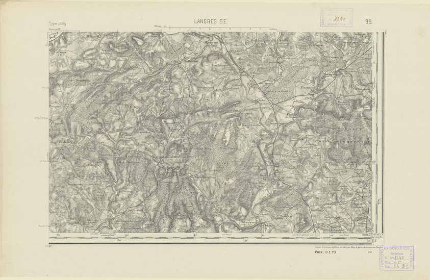 "Paris. Service Géographique de l'Armée, 1889. Ebbe origine dall'Edizione zincografica in quarti di foglio, stabilita dal 1879, per la carta detta de "L'Etat-Major". Infatti non rispondono più il sistema della riproduzione zincografica alle esigenze che la revisione dei fogli imponeva, per un inevitabile logoramento dei rami originali, fu proposta dapprima la correzione degli zinchi, ma questo, importando un lavoro lungo e gravoso, si adottò il procedimento galvanico. I rami galvanici ottenuti e corretti secondo questo sistema presero il nome di "édition type 1889". Allo scopo di facilitare l'incisione fu adoperata la suddivisione in quarti di foglio come per l'edizione zincografica. La revisione dei fogli di questo tipo non fu iniziata che nel 1893. Dal catalogo del S.G.A. risultano mancanti a questa edizione i dipartimenti della "Moselle", del "Bas-Rhin" e del "Haut-Rhin" per i quali non esiste che una edizione in fogli interi aggiornata nel 1901."