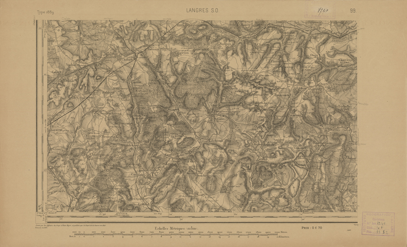 "Paris. Service Géographique de l'Armée, 1889. Ebbe origine dall'Edizione zincografica in quarti di foglio, stabilita dal 1879, per la carta detta de "L'Etat-Major". Infatti non rispondono più il sistema della riproduzione zincografica alle esigenze che la revisione dei fogli imponeva, per un inevitabile logoramento dei rami originali, fu proposta dapprima la correzione degli zinchi, ma questo, importando un lavoro lungo e gravoso, si adottò il procedimento galvanico. I rami galvanici ottenuti e corretti secondo questo sistema presero il nome di "édition type 1889". Allo scopo di facilitare l'incisione fu adoperata la suddivisione in quarti di foglio come per l'edizione zincografica. La revisione dei fogli di questo tipo non fu iniziata che nel 1893. Dal catalogo del S.G.A. risultano mancanti a questa edizione i dipartimenti della "Moselle", del "Bas-Rhin" e del "Haut-Rhin" per i quali non esiste che una edizione in fogli interi aggiornata nel 1901."
