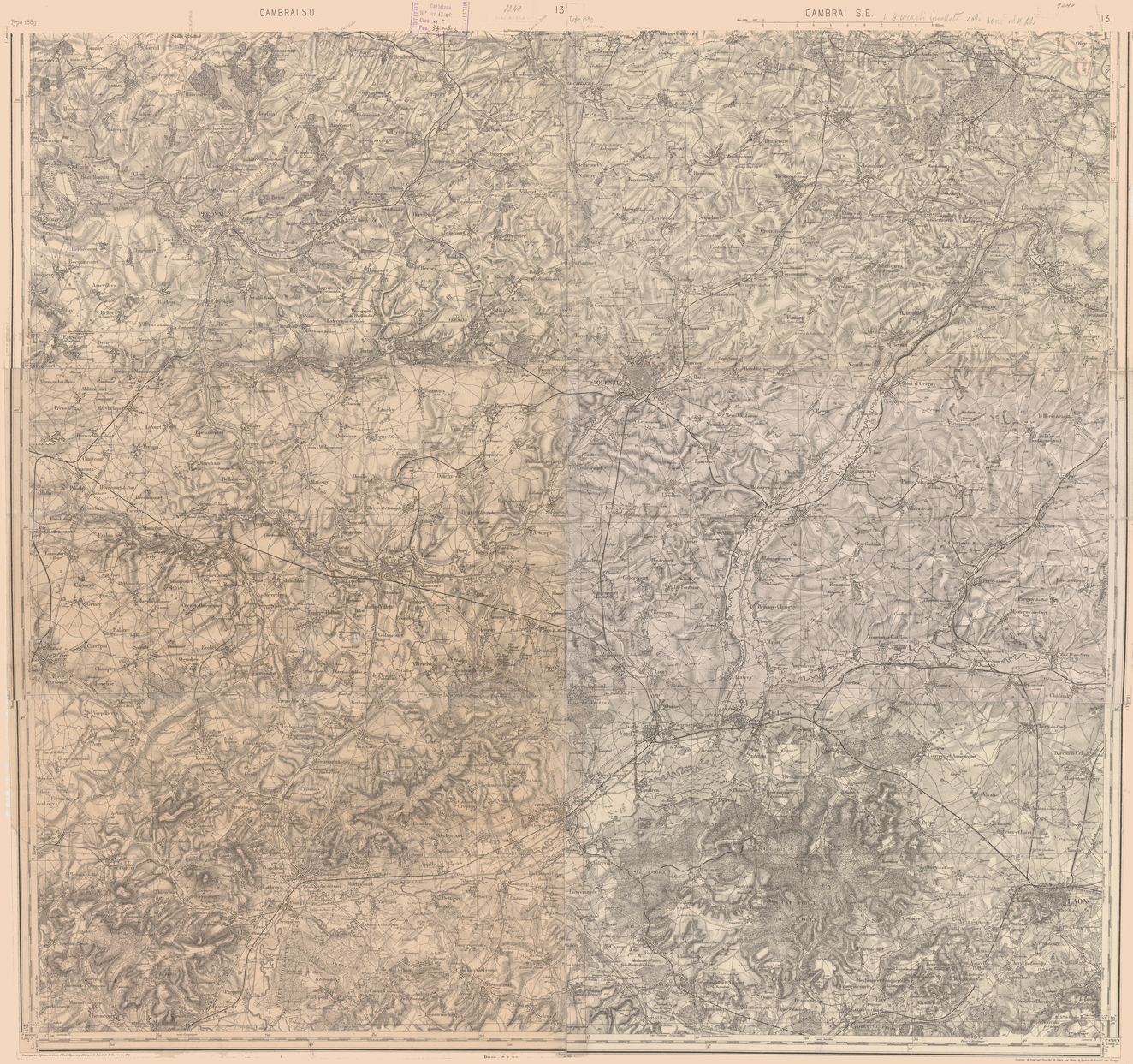 "Paris. Service Géographique de l'Armée, 1889. Ebbe origine dall'Edizione zincografica in quarti di foglio, stabilita dal 1879, per la carta detta de "L'Etat-Major". Infatti non rispondono più il sistema della riproduzione zincografica alle esigenze che la revisione dei fogli imponeva, per un inevitabile logoramento dei rami originali, fu proposta dapprima la correzione degli zinchi, ma questo, importando un lavoro lungo e gravoso, si adottò il procedimento galvanico. I rami galvanici ottenuti e corretti secondo questo sistema presero il nome di "édition type 1889". Allo scopo di facilitare l'incisione fu adoperata la suddivisione in quarti di foglio come per l'edizione zincografica. La revisione dei fogli di questo tipo non fu iniziata che nel 1893. Dal catalogo del S.G.A. risultano mancanti a questa edizione i dipartimenti della "Moselle", del "Bas-Rhin" e del "Haut-Rhin" per i quali non esiste che una edizione in fogli interi aggiornata nel 1901."
