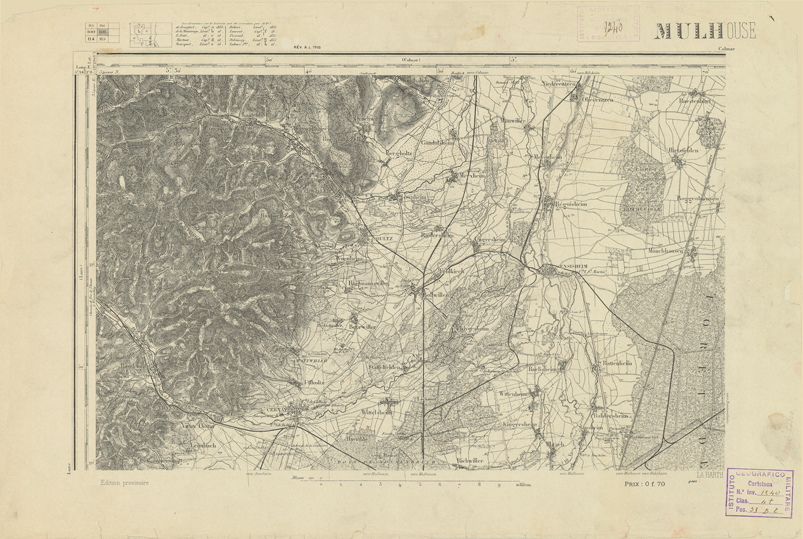 "Paris. Service Géographique de l'Armée, 1889. Ebbe origine dall'Edizione zincografica in quarti di foglio, stabilita dal 1879, per la carta detta de "L'Etat-Major". Infatti non rispondono più il sistema della riproduzione zincografica alle esigenze che la revisione dei fogli imponeva, per un inevitabile logoramento dei rami originali, fu proposta dapprima la correzione degli zinchi, ma questo, importando un lavoro lungo e gravoso, si adottò il procedimento galvanico. I rami galvanici ottenuti e corretti secondo questo sistema presero il nome di "édition type 1889". Allo scopo di facilitare l'incisione fu adoperata la suddivisione in quarti di foglio come per l'edizione zincografica. La revisione dei fogli di questo tipo non fu iniziata che nel 1893. Dal catalogo del S.G.A. risultano mancanti a questa edizione i dipartimenti della "Moselle", del "Bas-Rhin" e del "Haut-Rhin" per i quali non esiste che una edizione in fogli interi aggiornata nel 1901."