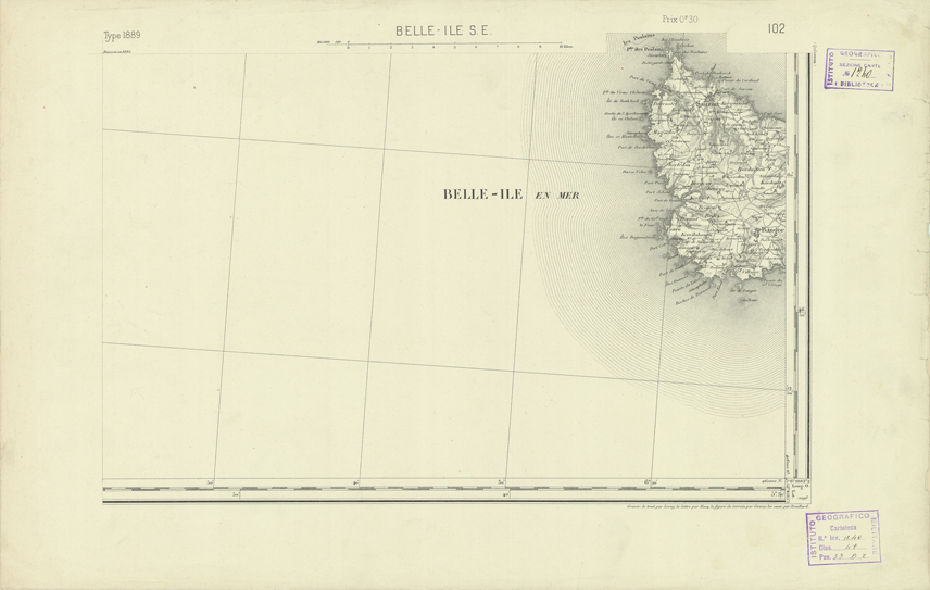 "Paris. Service Géographique de l'Armée, 1889. Ebbe origine dall'Edizione zincografica in quarti di foglio, stabilita dal 1879, per la carta detta de "L'Etat-Major". Infatti non rispondono più il sistema della riproduzione zincografica alle esigenze che la revisione dei fogli imponeva, per un inevitabile logoramento dei rami originali, fu proposta dapprima la correzione degli zinchi, ma questo, importando un lavoro lungo e gravoso, si adottò il procedimento galvanico. I rami galvanici ottenuti e corretti secondo questo sistema presero il nome di "édition type 1889". Allo scopo di facilitare l'incisione fu adoperata la suddivisione in quarti di foglio come per l'edizione zincografica. La revisione dei fogli di questo tipo non fu iniziata che nel 1893. Dal catalogo del S.G.A. risultano mancanti a questa edizione i dipartimenti della "Moselle", del "Bas-Rhin" e del "Haut-Rhin" per i quali non esiste che una edizione in fogli interi aggiornata nel 1901."