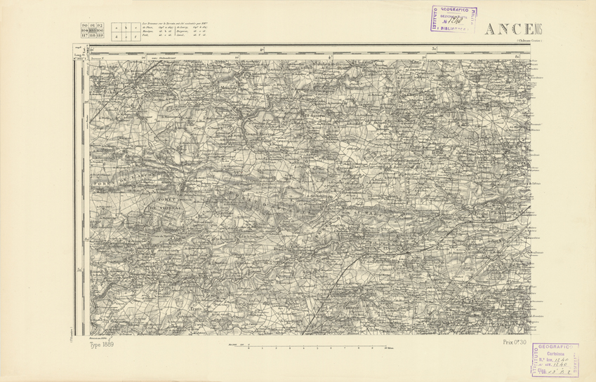 "Paris. Service Géographique de l'Armée, 1889. Ebbe origine dall'Edizione zincografica in quarti di foglio, stabilita dal 1879, per la carta detta de "L'Etat-Major". Infatti non rispondono più il sistema della riproduzione zincografica alle esigenze che la revisione dei fogli imponeva, per un inevitabile logoramento dei rami originali, fu proposta dapprima la correzione degli zinchi, ma questo, importando un lavoro lungo e gravoso, si adottò il procedimento galvanico. I rami galvanici ottenuti e corretti secondo questo sistema presero il nome di "édition type 1889". Allo scopo di facilitare l'incisione fu adoperata la suddivisione in quarti di foglio come per l'edizione zincografica. La revisione dei fogli di questo tipo non fu iniziata che nel 1893. Dal catalogo del S.G.A. risultano mancanti a questa edizione i dipartimenti della "Moselle", del "Bas-Rhin" e del "Haut-Rhin" per i quali non esiste che una edizione in fogli interi aggiornata nel 1901."
