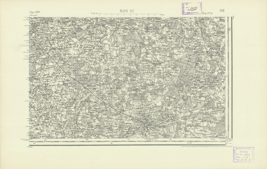 "Paris. Service Géographique de l'Armée, 1889. Ebbe origine dall'Edizione zincografica in quarti di foglio, stabilita dal 1879, per la carta detta de "L'Etat-Major". Infatti non rispondono più il sistema della riproduzione zincografica alle esigenze che la revisione dei fogli imponeva, per un inevitabile logoramento dei rami originali, fu proposta dapprima la correzione degli zinchi, ma questo, importando un lavoro lungo e gravoso, si adottò il procedimento galvanico. I rami galvanici ottenuti e corretti secondo questo sistema presero il nome di "édition type 1889". Allo scopo di facilitare l'incisione fu adoperata la suddivisione in quarti di foglio come per l'edizione zincografica. La revisione dei fogli di questo tipo non fu iniziata che nel 1893. Dal catalogo del S.G.A. risultano mancanti a questa edizione i dipartimenti della "Moselle", del "Bas-Rhin" e del "Haut-Rhin" per i quali non esiste che una edizione in fogli interi aggiornata nel 1901."