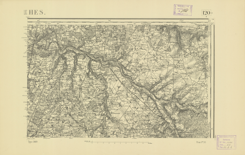 "Paris. Service Géographique de l'Armée, 1889. Ebbe origine dall'Edizione zincografica in quarti di foglio, stabilita dal 1879, per la carta detta de "L'Etat-Major". Infatti non rispondono più il sistema della riproduzione zincografica alle esigenze che la revisione dei fogli imponeva, per un inevitabile logoramento dei rami originali, fu proposta dapprima la correzione degli zinchi, ma questo, importando un lavoro lungo e gravoso, si adottò il procedimento galvanico. I rami galvanici ottenuti e corretti secondo questo sistema presero il nome di "édition type 1889". Allo scopo di facilitare l'incisione fu adoperata la suddivisione in quarti di foglio come per l'edizione zincografica. La revisione dei fogli di questo tipo non fu iniziata che nel 1893. Dal catalogo del S.G.A. risultano mancanti a questa edizione i dipartimenti della "Moselle", del "Bas-Rhin" e del "Haut-Rhin" per i quali non esiste che una edizione in fogli interi aggiornata nel 1901."