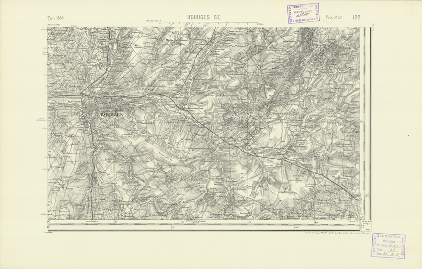 "Paris. Service Géographique de l'Armée, 1889. Ebbe origine dall'Edizione zincografica in quarti di foglio, stabilita dal 1879, per la carta detta de "L'Etat-Major". Infatti non rispondono più il sistema della riproduzione zincografica alle esigenze che la revisione dei fogli imponeva, per un inevitabile logoramento dei rami originali, fu proposta dapprima la correzione degli zinchi, ma questo, importando un lavoro lungo e gravoso, si adottò il procedimento galvanico. I rami galvanici ottenuti e corretti secondo questo sistema presero il nome di "édition type 1889". Allo scopo di facilitare l'incisione fu adoperata la suddivisione in quarti di foglio come per l'edizione zincografica. La revisione dei fogli di questo tipo non fu iniziata che nel 1893. Dal catalogo del S.G.A. risultano mancanti a questa edizione i dipartimenti della "Moselle", del "Bas-Rhin" e del "Haut-Rhin" per i quali non esiste che una edizione in fogli interi aggiornata nel 1901."
