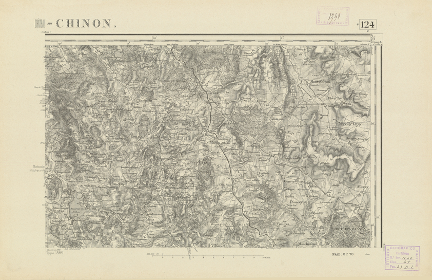 "Paris. Service Géographique de l'Armée, 1889. Ebbe origine dall'Edizione zincografica in quarti di foglio, stabilita dal 1879, per la carta detta de "L'Etat-Major". Infatti non rispondono più il sistema della riproduzione zincografica alle esigenze che la revisione dei fogli imponeva, per un inevitabile logoramento dei rami originali, fu proposta dapprima la correzione degli zinchi, ma questo, importando un lavoro lungo e gravoso, si adottò il procedimento galvanico. I rami galvanici ottenuti e corretti secondo questo sistema presero il nome di "édition type 1889". Allo scopo di facilitare l'incisione fu adoperata la suddivisione in quarti di foglio come per l'edizione zincografica. La revisione dei fogli di questo tipo non fu iniziata che nel 1893. Dal catalogo del S.G.A. risultano mancanti a questa edizione i dipartimenti della "Moselle", del "Bas-Rhin" e del "Haut-Rhin" per i quali non esiste che una edizione in fogli interi aggiornata nel 1901."