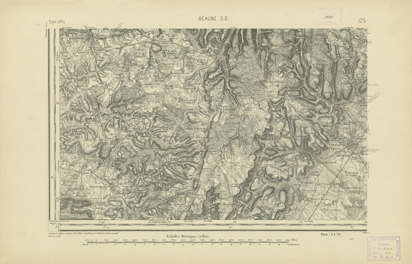 "Paris. Service Géographique de l'Armée, 1889. Ebbe origine dall'Edizione zincografica in quarti di foglio, stabilita dal 1879, per la carta detta de "L'Etat-Major". Infatti non rispondono più il sistema della riproduzione zincografica alle esigenze che la revisione dei fogli imponeva, per un inevitabile logoramento dei rami originali, fu proposta dapprima la correzione degli zinchi, ma questo, importando un lavoro lungo e gravoso, si adottò il procedimento galvanico. I rami galvanici ottenuti e corretti secondo questo sistema presero il nome di "édition type 1889". Allo scopo di facilitare l'incisione fu adoperata la suddivisione in quarti di foglio come per l'edizione zincografica. La revisione dei fogli di questo tipo non fu iniziata che nel 1893. Dal catalogo del S.G.A. risultano mancanti a questa edizione i dipartimenti della "Moselle", del "Bas-Rhin" e del "Haut-Rhin" per i quali non esiste che una edizione in fogli interi aggiornata nel 1901."