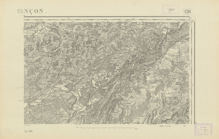 "Paris. Service Géographique de l'Armée, 1889. Ebbe origine dall'Edizione zincografica in quarti di foglio, stabilita dal 1879, per la carta detta de "L'Etat-Major". Infatti non rispondono più il sistema della riproduzione zincografica alle esigenze che la revisione dei fogli imponeva, per un inevitabile logoramento dei rami originali, fu proposta dapprima la correzione degli zinchi, ma questo, importando un lavoro lungo e gravoso, si adottò il procedimento galvanico. I rami galvanici ottenuti e corretti secondo questo sistema presero il nome di "édition type 1889". Allo scopo di facilitare l'incisione fu adoperata la suddivisione in quarti di foglio come per l'edizione zincografica. La revisione dei fogli di questo tipo non fu iniziata che nel 1893. Dal catalogo del S.G.A. risultano mancanti a questa edizione i dipartimenti della "Moselle", del "Bas-Rhin" e del "Haut-Rhin" per i quali non esiste che una edizione in fogli interi aggiornata nel 1901."
