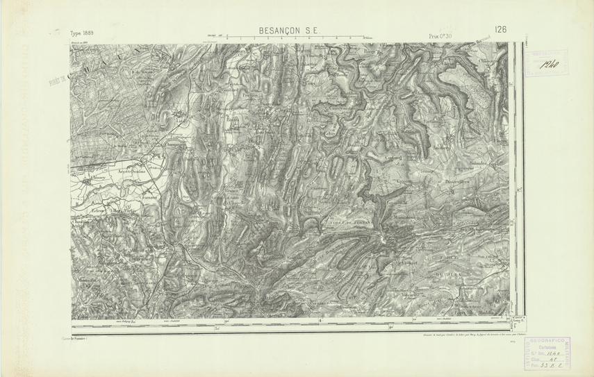 "Paris. Service Géographique de l'Armée, 1889. Ebbe origine dall'Edizione zincografica in quarti di foglio, stabilita dal 1879, per la carta detta de "L'Etat-Major". Infatti non rispondono più il sistema della riproduzione zincografica alle esigenze che la revisione dei fogli imponeva, per un inevitabile logoramento dei rami originali, fu proposta dapprima la correzione degli zinchi, ma questo, importando un lavoro lungo e gravoso, si adottò il procedimento galvanico. I rami galvanici ottenuti e corretti secondo questo sistema presero il nome di "édition type 1889". Allo scopo di facilitare l'incisione fu adoperata la suddivisione in quarti di foglio come per l'edizione zincografica. La revisione dei fogli di questo tipo non fu iniziata che nel 1893. Dal catalogo del S.G.A. risultano mancanti a questa edizione i dipartimenti della "Moselle", del "Bas-Rhin" e del "Haut-Rhin" per i quali non esiste che una edizione in fogli interi aggiornata nel 1901."