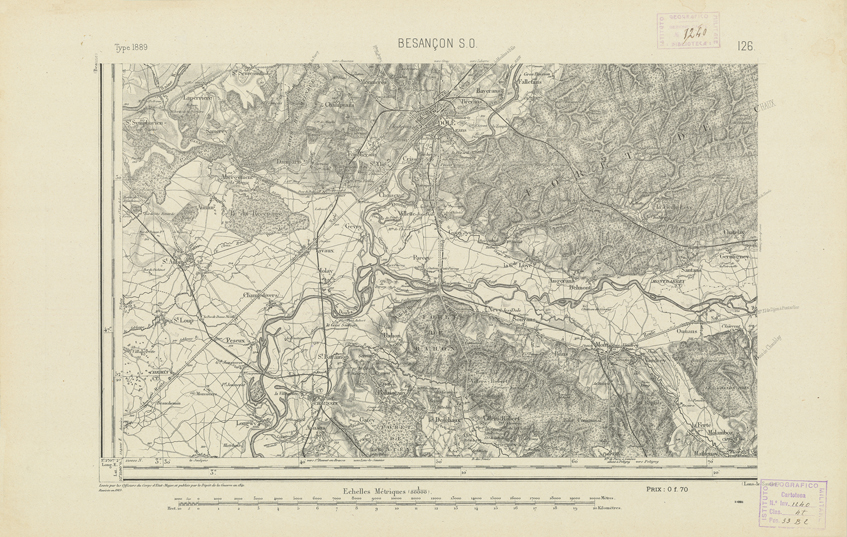 "Paris. Service Géographique de l'Armée, 1889. Ebbe origine dall'Edizione zincografica in quarti di foglio, stabilita dal 1879, per la carta detta de "L'Etat-Major". Infatti non rispondono più il sistema della riproduzione zincografica alle esigenze che la revisione dei fogli imponeva, per un inevitabile logoramento dei rami originali, fu proposta dapprima la correzione degli zinchi, ma questo, importando un lavoro lungo e gravoso, si adottò il procedimento galvanico. I rami galvanici ottenuti e corretti secondo questo sistema presero il nome di "édition type 1889". Allo scopo di facilitare l'incisione fu adoperata la suddivisione in quarti di foglio come per l'edizione zincografica. La revisione dei fogli di questo tipo non fu iniziata che nel 1893. Dal catalogo del S.G.A. risultano mancanti a questa edizione i dipartimenti della "Moselle", del "Bas-Rhin" e del "Haut-Rhin" per i quali non esiste che una edizione in fogli interi aggiornata nel 1901."