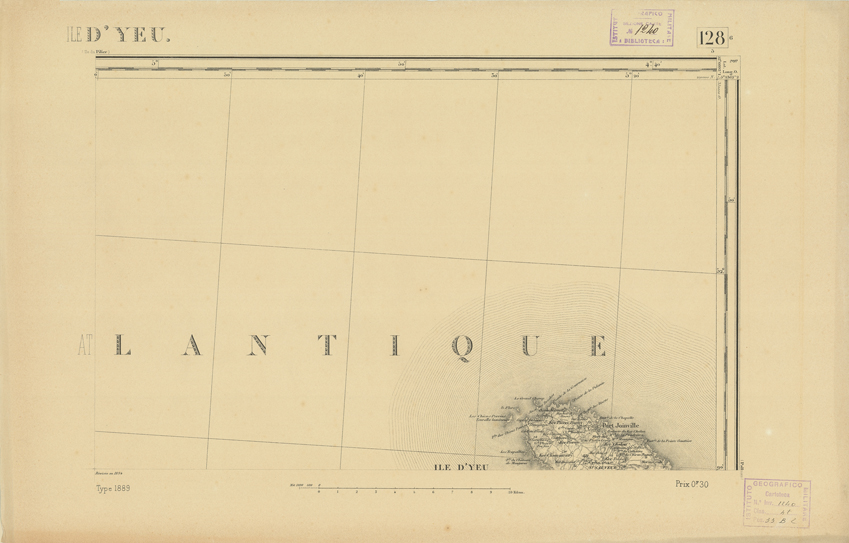 "Paris. Service Géographique de l'Armée, 1889. Ebbe origine dall'Edizione zincografica in quarti di foglio, stabilita dal 1879, per la carta detta de "L'Etat-Major". Infatti non rispondono più il sistema della riproduzione zincografica alle esigenze che la revisione dei fogli imponeva, per un inevitabile logoramento dei rami originali, fu proposta dapprima la correzione degli zinchi, ma questo, importando un lavoro lungo e gravoso, si adottò il procedimento galvanico. I rami galvanici ottenuti e corretti secondo questo sistema presero il nome di "édition type 1889". Allo scopo di facilitare l'incisione fu adoperata la suddivisione in quarti di foglio come per l'edizione zincografica. La revisione dei fogli di questo tipo non fu iniziata che nel 1893. Dal catalogo del S.G.A. risultano mancanti a questa edizione i dipartimenti della "Moselle", del "Bas-Rhin" e del "Haut-Rhin" per i quali non esiste che una edizione in fogli interi aggiornata nel 1901."