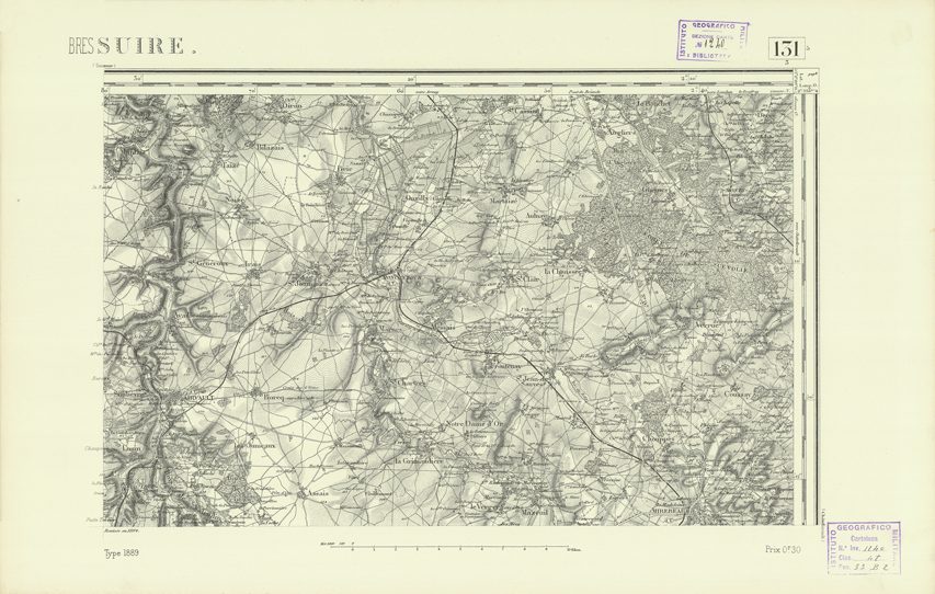 "Paris. Service Géographique de l'Armée, 1889. Ebbe origine dall'Edizione zincografica in quarti di foglio, stabilita dal 1879, per la carta detta de "L'Etat-Major". Infatti non rispondono più il sistema della riproduzione zincografica alle esigenze che la revisione dei fogli imponeva, per un inevitabile logoramento dei rami originali, fu proposta dapprima la correzione degli zinchi, ma questo, importando un lavoro lungo e gravoso, si adottò il procedimento galvanico. I rami galvanici ottenuti e corretti secondo questo sistema presero il nome di "édition type 1889". Allo scopo di facilitare l'incisione fu adoperata la suddivisione in quarti di foglio come per l'edizione zincografica. La revisione dei fogli di questo tipo non fu iniziata che nel 1893. Dal catalogo del S.G.A. risultano mancanti a questa edizione i dipartimenti della "Moselle", del "Bas-Rhin" e del "Haut-Rhin" per i quali non esiste che una edizione in fogli interi aggiornata nel 1901."